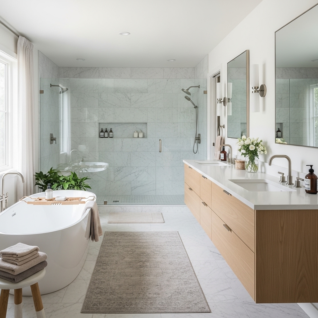 This master bathroom and closet renovation delivers a spa-inspired retreat with a custom walk-in shower, freestanding tub, and elegant tile work. Thoughtful layout upgrades and modern finishes create a seamless, functional, and luxurious space.
