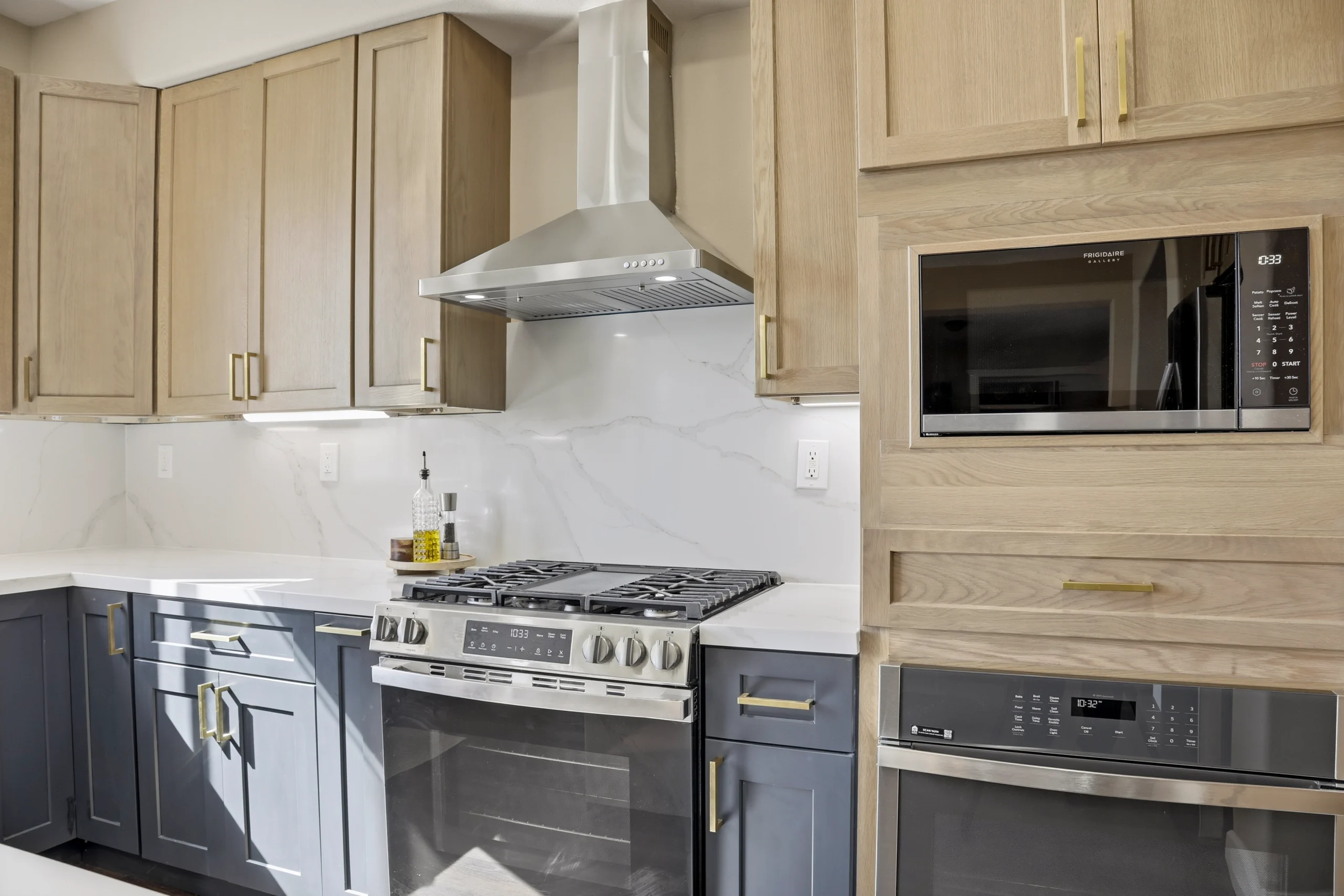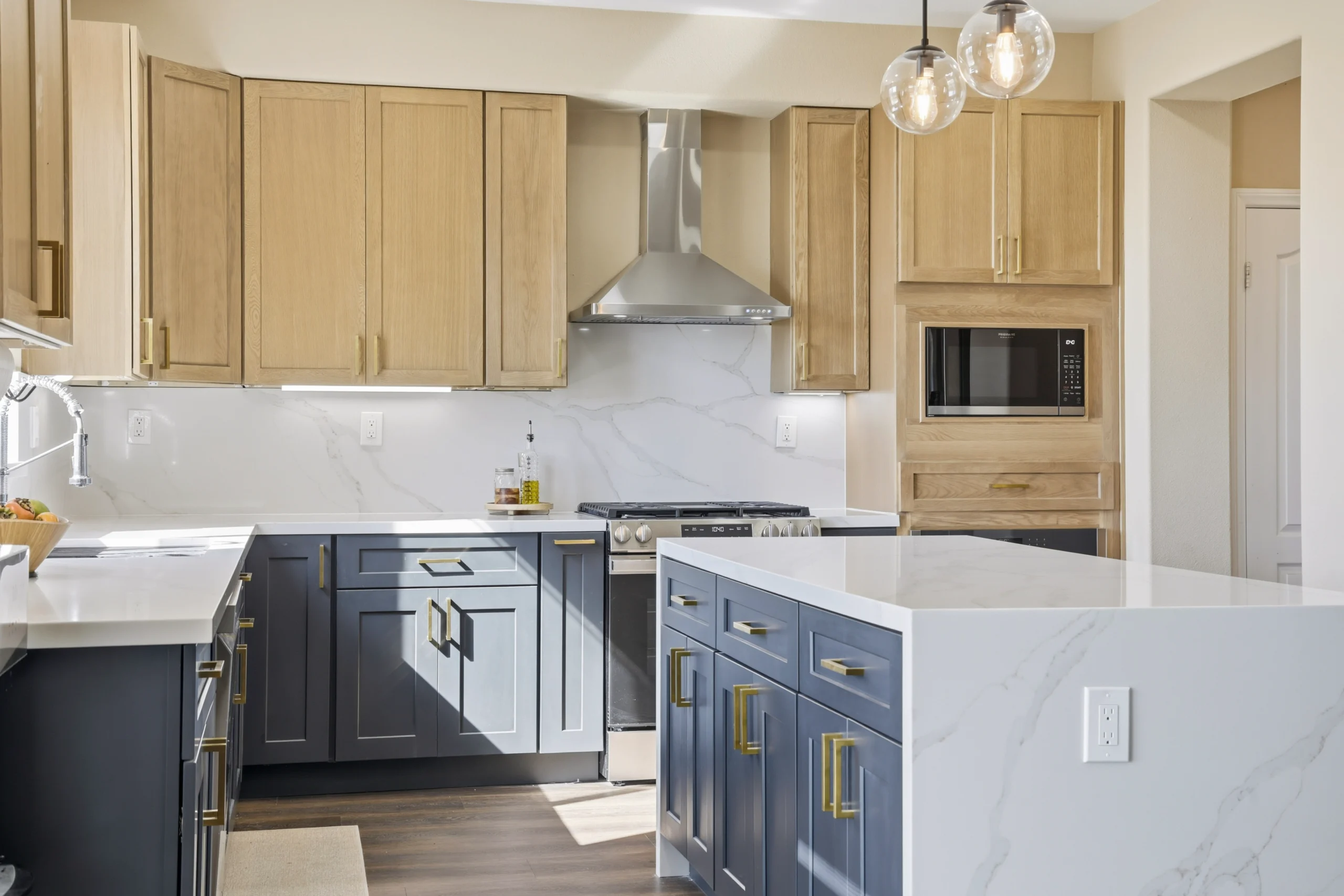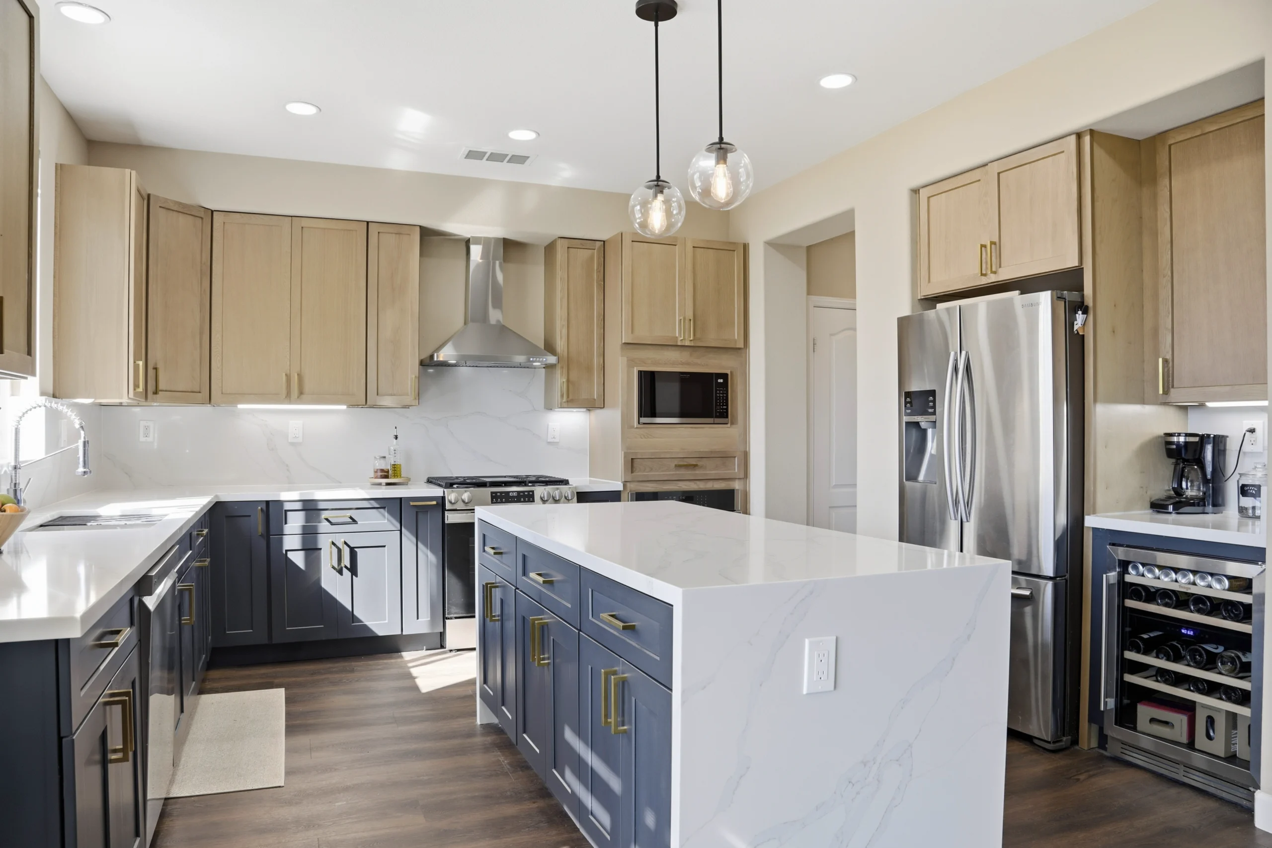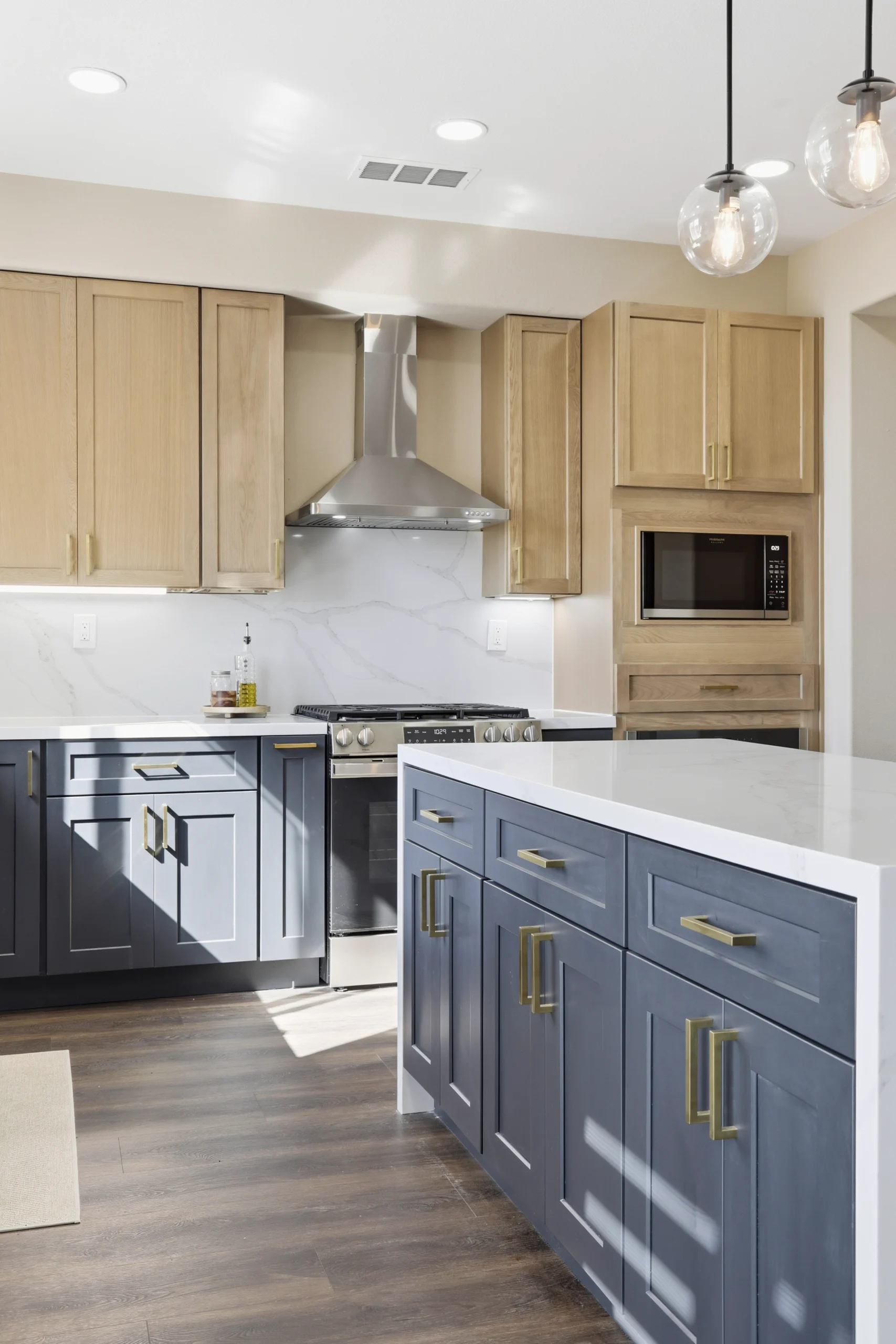 This project transformed an outdated kitchen into a bright, modern space with a clean two-tone design. Natural wood upper cabinets are paired with deep blue lower cabinets and a statement island, all accented with sleek brass hardware. A custom quartz island with waterfall edges serves as the centerpiece, complemented by matching countertops and a seamless backsplash for a polished, cohesive look. Stainless steel appliances, upgraded lighting, and improved plumbing and electrical systems enhance both functionality and efficiency.