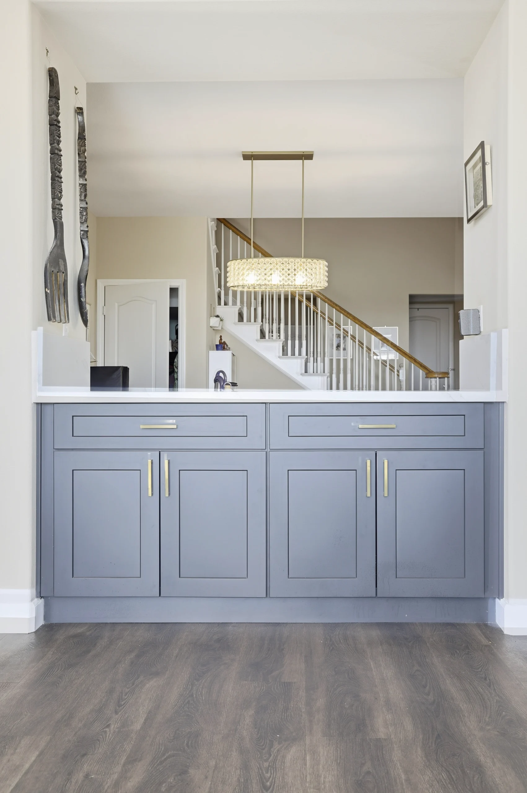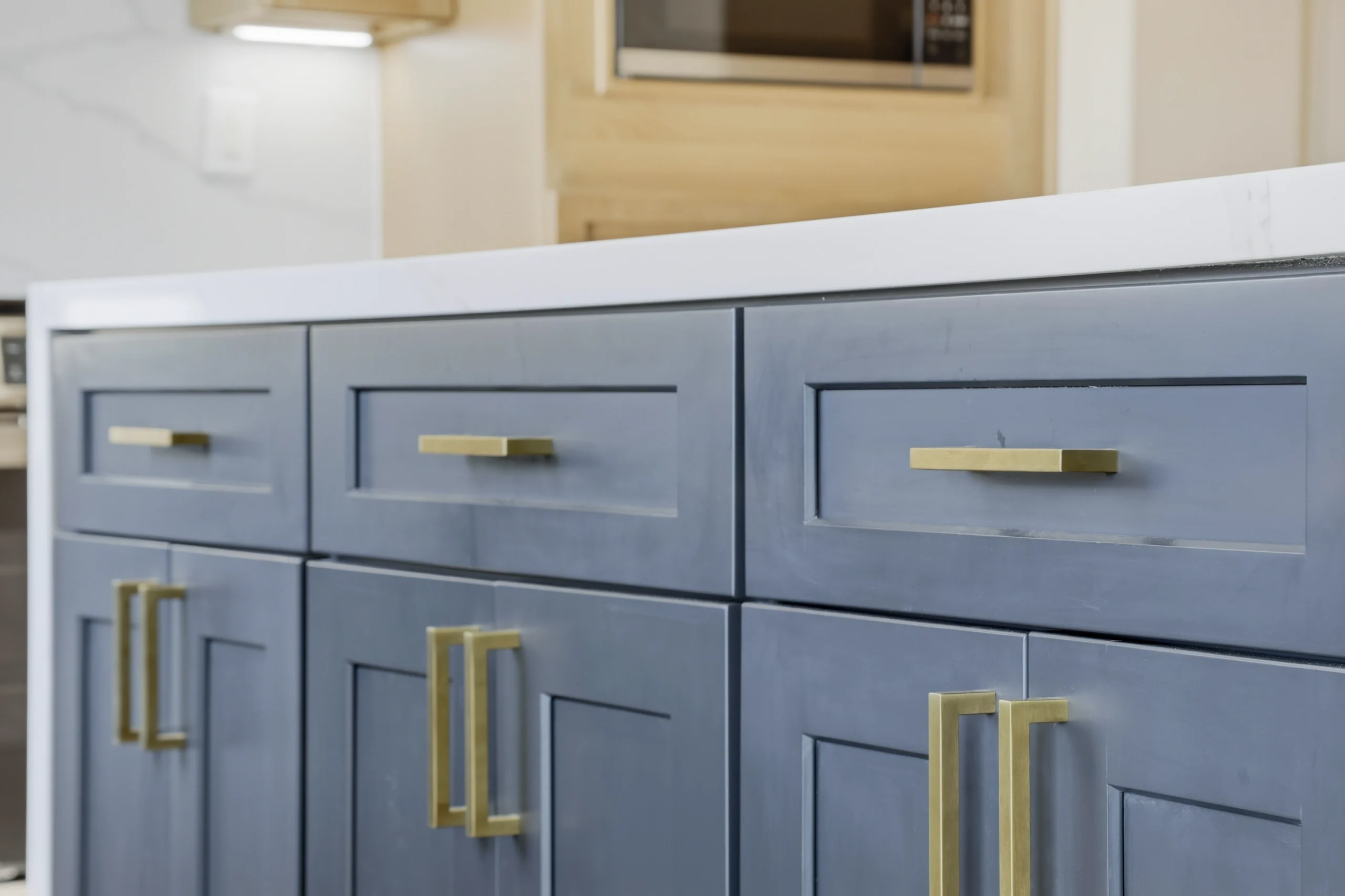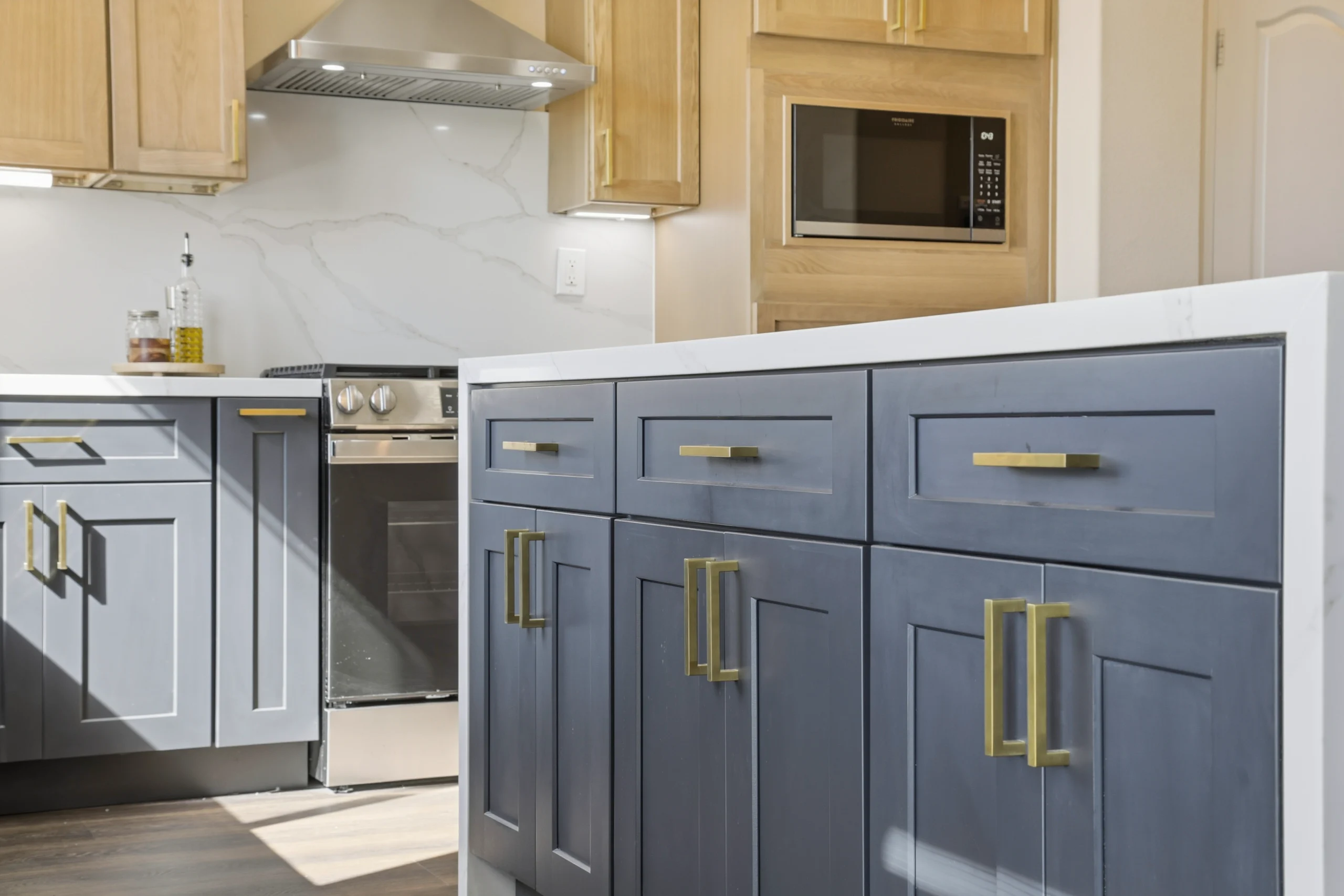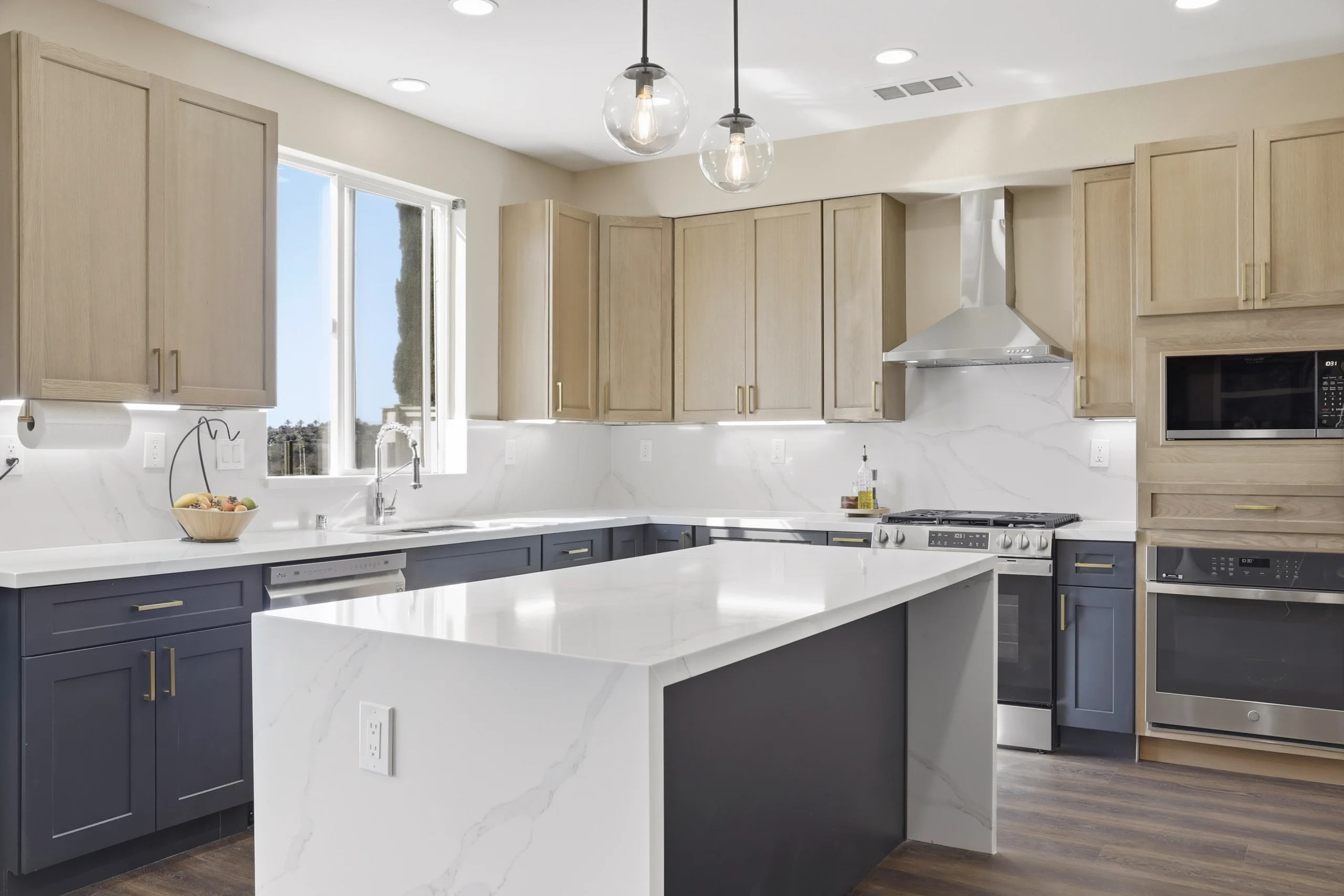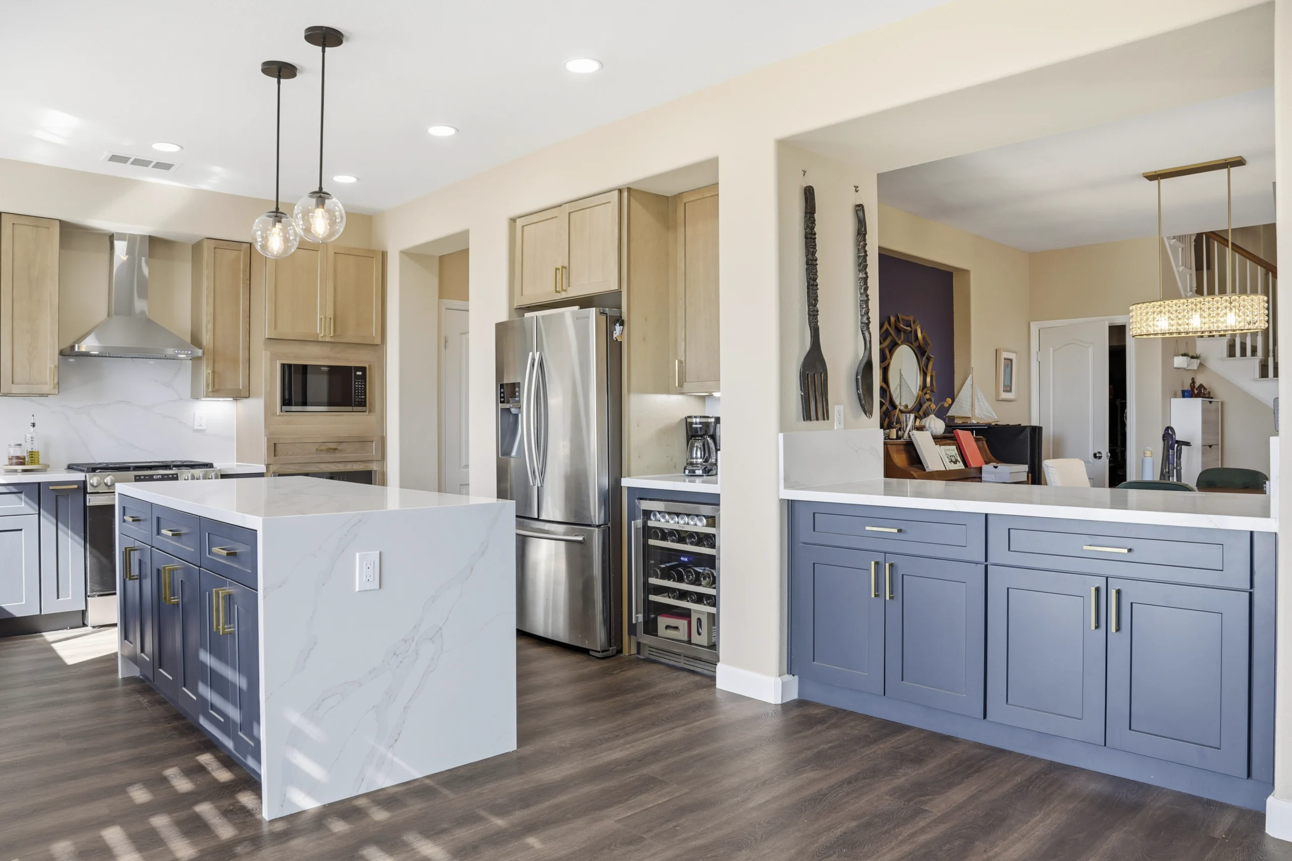 This project transformed an outdated kitchen into a bright, modern space with a clean two-tone design. Natural wood upper cabinets are paired with deep blue lower cabinets and a statement island, all accented with sleek brass hardware. A custom quartz island with waterfall edges serves as the centerpiece, complemented by matching countertops and a seamless backsplash for a polished, cohesive look. Stainless steel appliances, upgraded lighting, and improved plumbing and electrical systems enhance both functionality and efficiency.