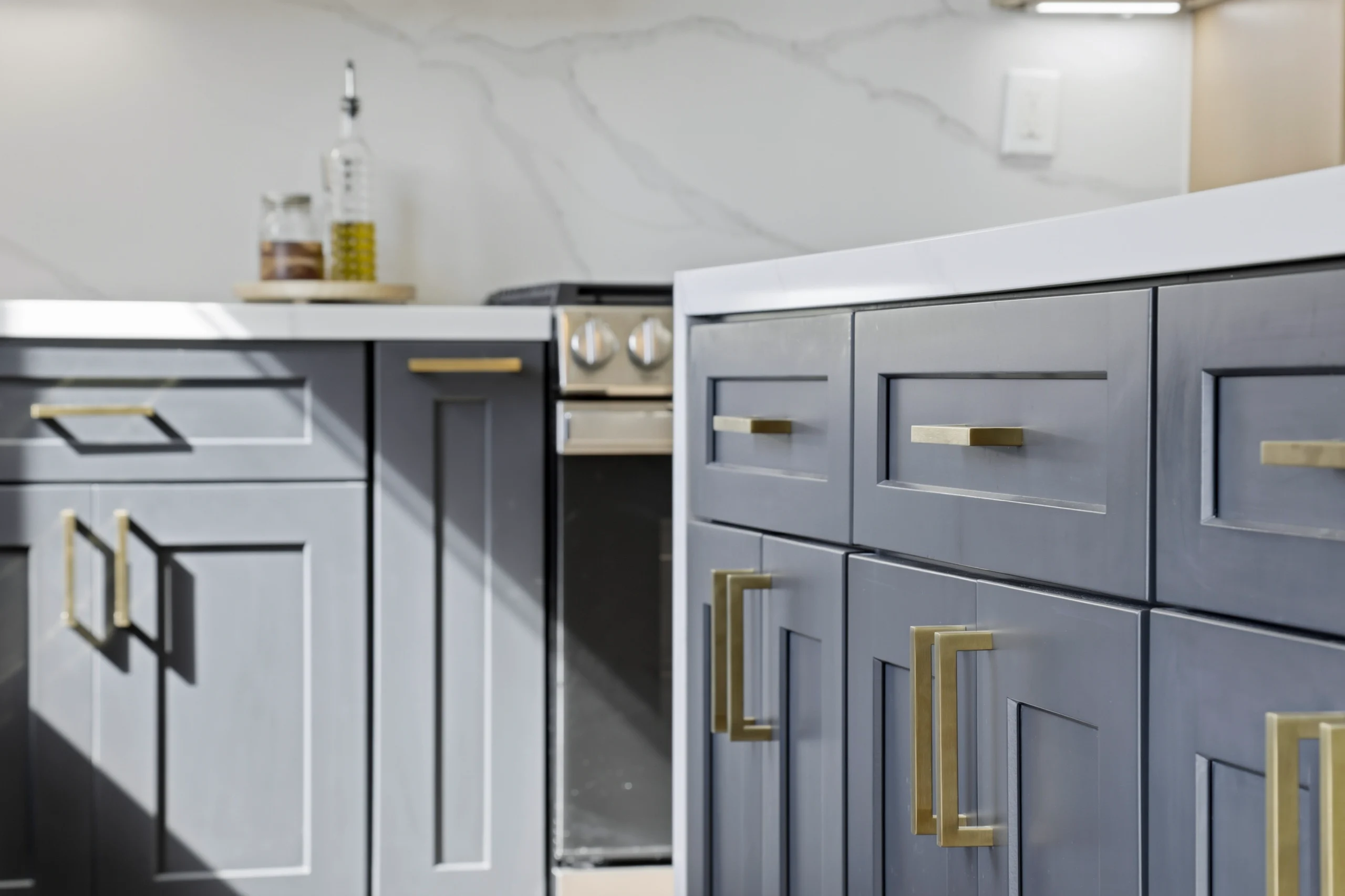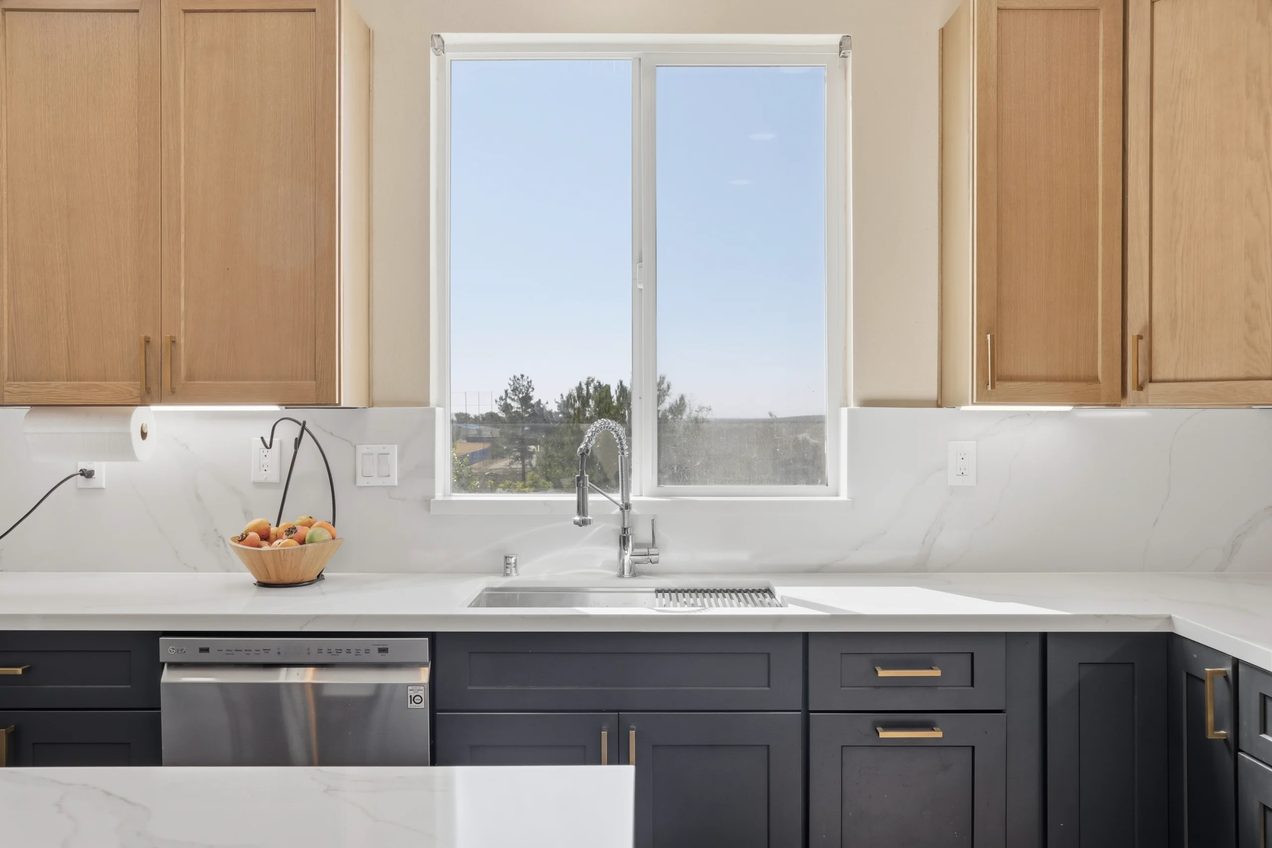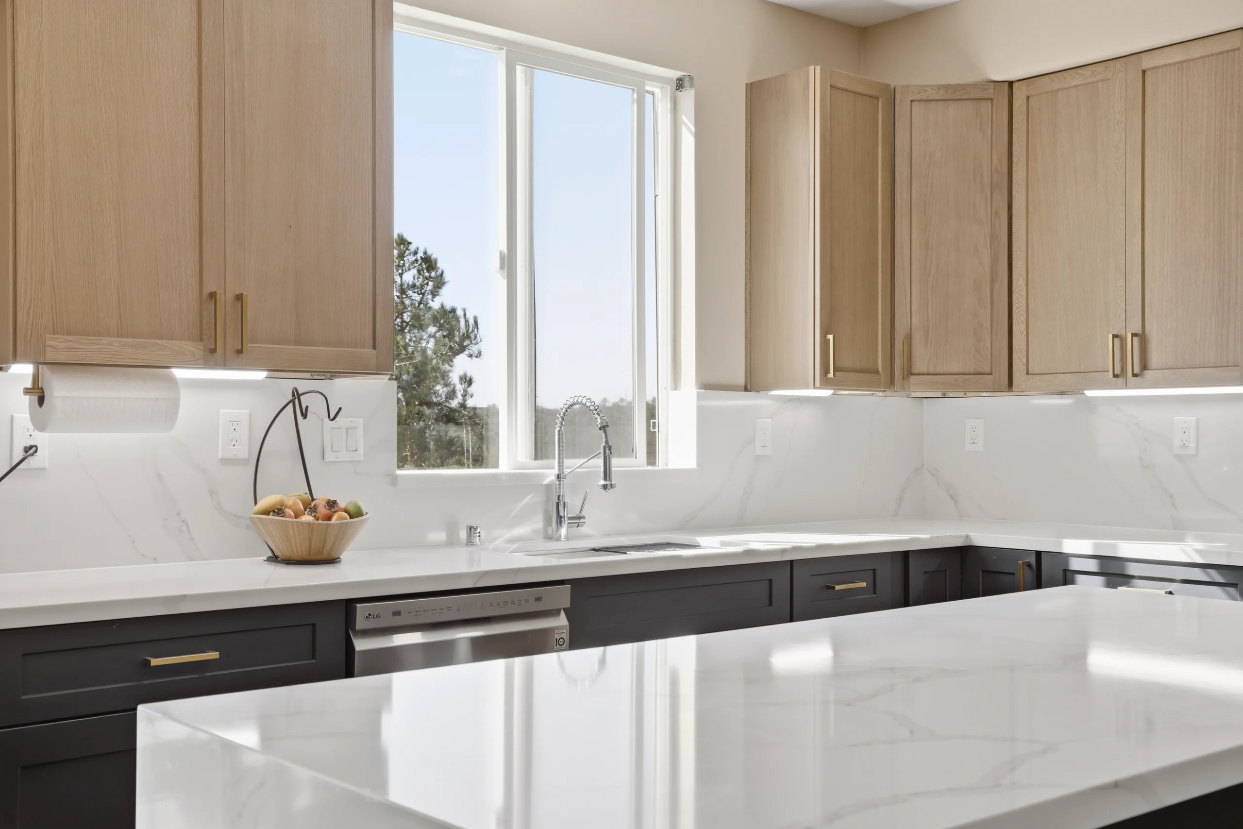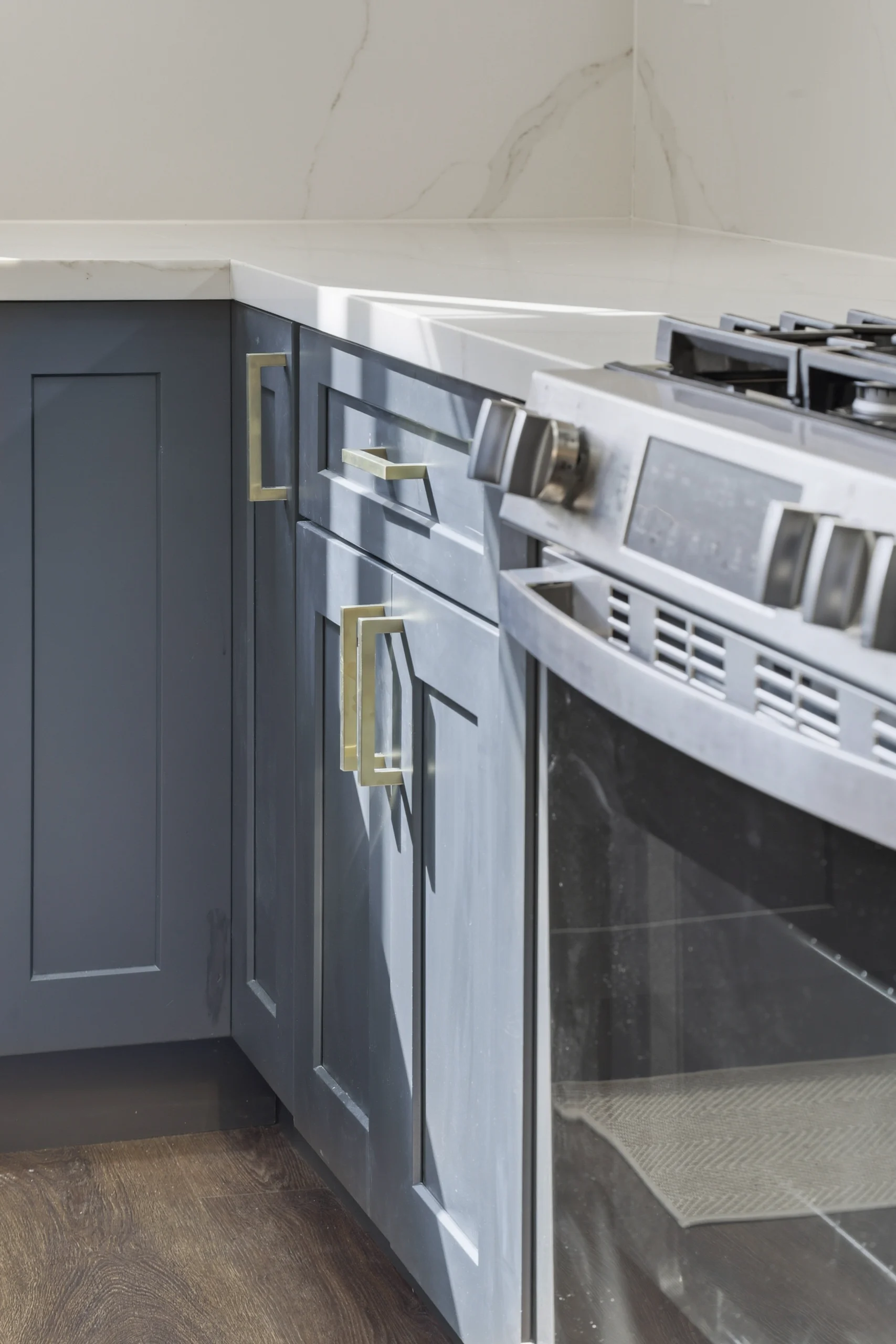 This project transformed an outdated kitchen into a bright, modern space with a clean two-tone design. Natural wood upper cabinets are paired with deep blue lower cabinets and a statement island, all accented with sleek brass hardware. A custom quartz island with waterfall edges serves as the centerpiece, complemented by matching countertops and a seamless backsplash for a polished, cohesive look. Stainless steel appliances, upgraded lighting, and improved plumbing and electrical systems enhance both functionality and efficiency.